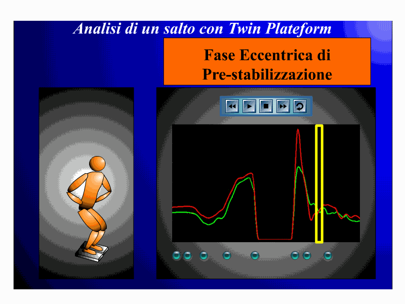 Nel momento in cui il soggetto si stacca dalle piattaforme (figura 9), le stesse non registrano più alcun segnale, non è quindi ovviamente possibile durante questa fase effettuare un tipo di analisi comparativa sui due arti. Tuttavia la fase di volo offre comunque la possibilità di una valutazione di tipo "assoluto" sulla capacità di espressione di forza esplosiva e di accumulo e conseguente restituzione di energia elastica da parte dellUMT, soprattutto se è possibile confrontare i dati registrati con gli stessi desunti in un periodo precedente allevento traumatico stesso.